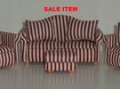 Used red & white striped 8-piece sofa set. Comprises of 1 x sofa with 2 cushions, 2 x armchairs with a cushion for each armchair and footstool.