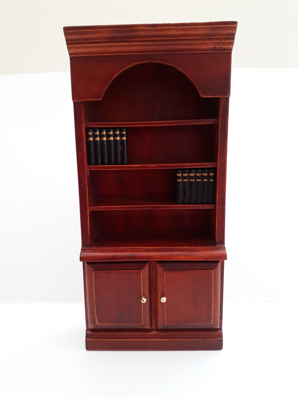 Mahogany wooden book unit with 3 shelves and 2 non-opening doors and 2 fixed block of black books