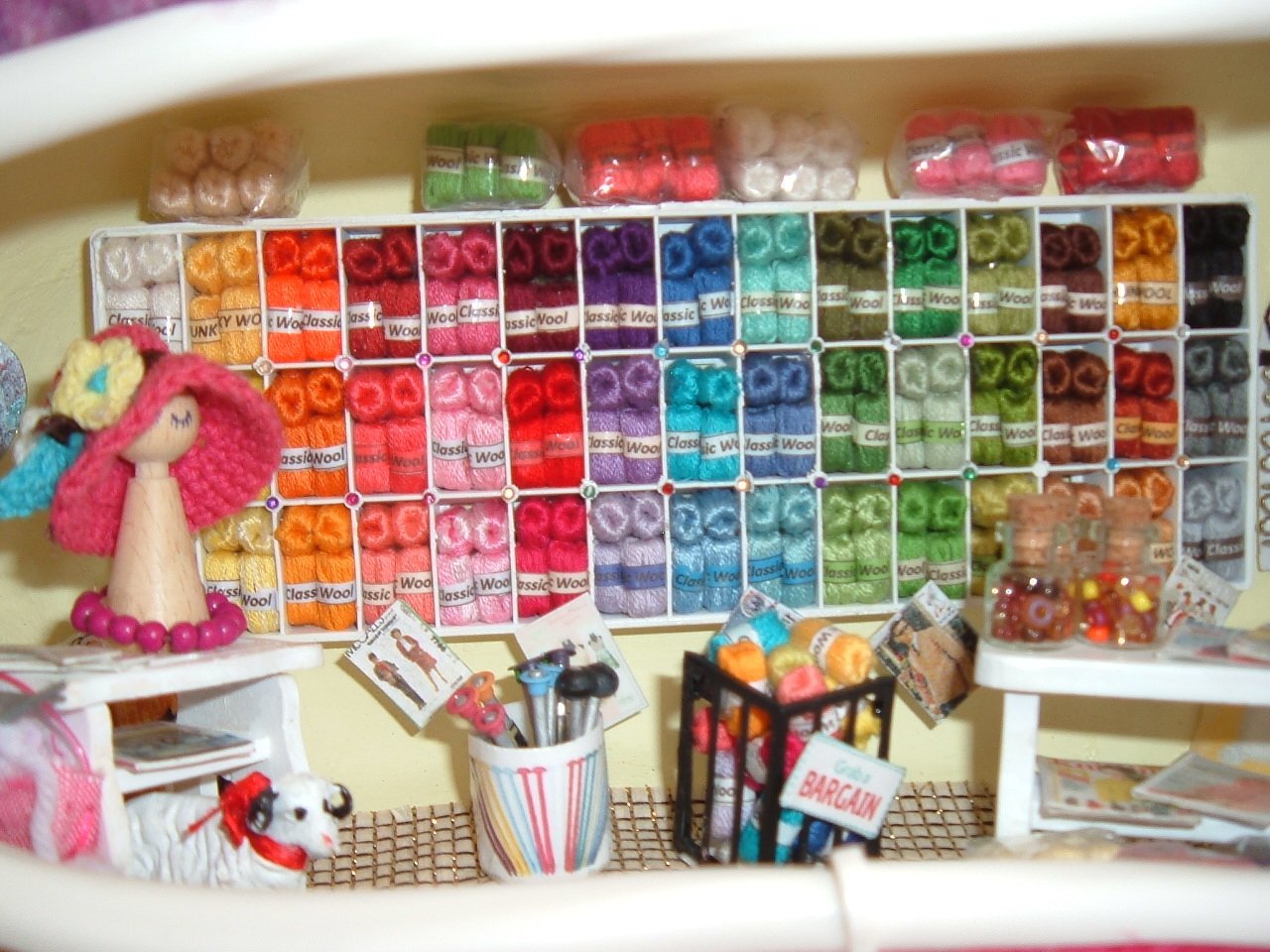 It makes a lovely, quiet space for knitting and crocheting. It's like bringing back a room with awkward corners, shadowy and narrow back to life with a miniature wool shop inside it. The surprise and detail is all inside this small packed space with lots of handmade miniature balls of wool!